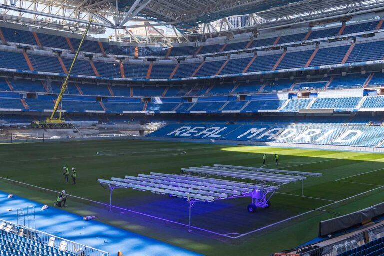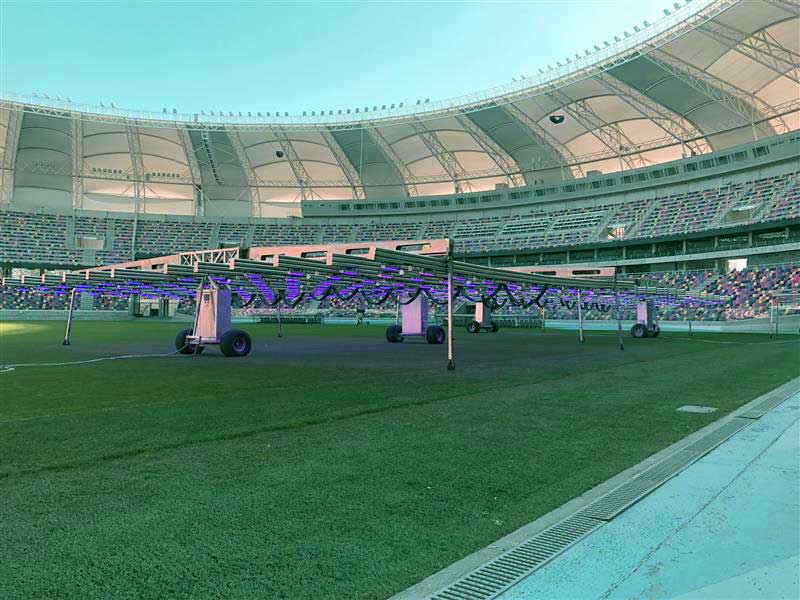 Rhenac setzte seine R-ML 30 und R-ML 200 mobilen LED-Wachstumslichtsysteme ein. Diese modularen Systeme bieten die Flexibilität, gezielt bestimmte Bereiche des Spielfelds zu beleuchten, die zusätzliche Unterstützung benötigen, darunter Zonen, die durch die Beschattung der Tribünen betroffen sind oder sich von intensiver Nutzung erholen.
